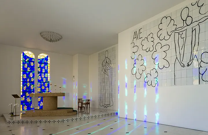 Sobre d’apparence, avec ses murs blancs, son toit de tuiles bleues et blanches et sa haute croix en fer forgé de 13 mètres, la chapelle se distingue surtout par la richesse de son intérieur. Matisse y a pensé chaque détail : vitraux aux teintes lumineuses (bleu, vert et jaune), fresques sur céramique évoquant Saint Dominique, la Nativité et le Chemin de Croix, mobilier dessiné par l’artiste.